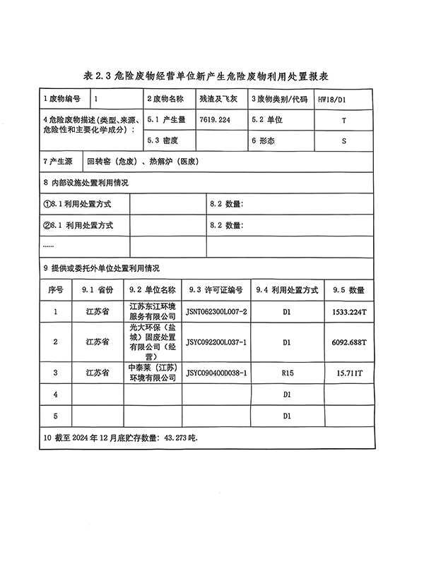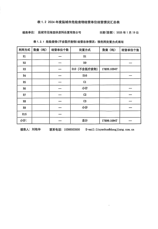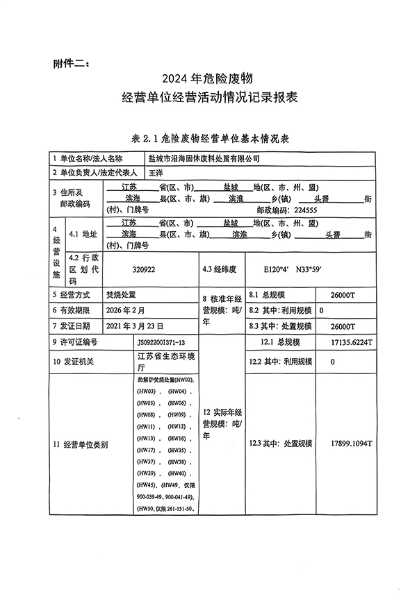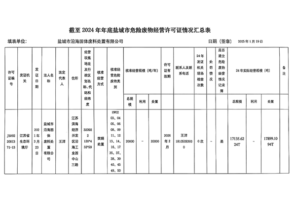 盐城市沿海固体废料处置有限公司2024年危险废物经营单位经营活动情况记录报表.