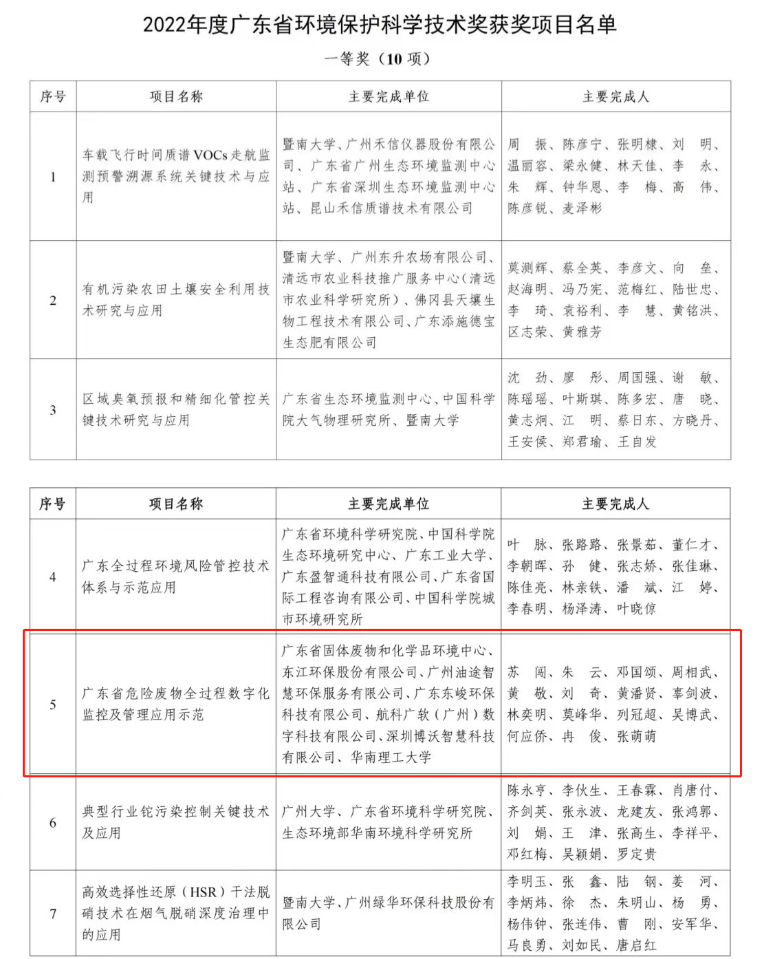 | 6月15日,2022年度广东省环境保护科学技术奖获奖名单正式公布,东江环保参与的由广东省固体废物和化学品环境中心牵头开展的《广东省危险废物全过程数字化监控及管理应用示范》项目,荣获2022年度广东省环境保护科学技术一等奖!