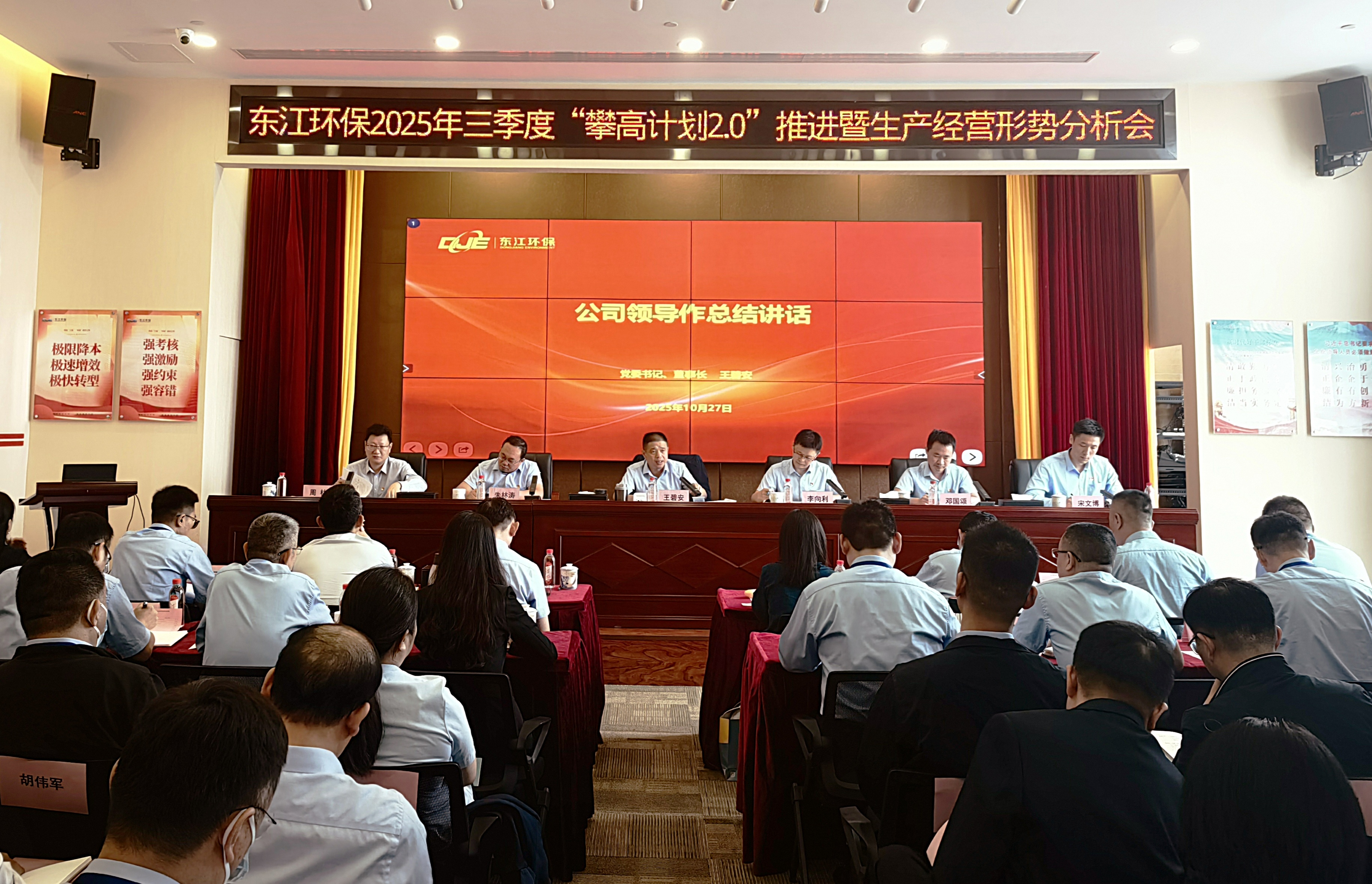 | 10月27日,东江环保召开2025年三季度“攀高计划2.0”推进会暨生产经营形势分析会,认真总结公司党建工作、“攀高计划2.0”落实情况、复盘前三季度经营工作情况,深入研判形势,剖析问题,部署下一阶段重点工作。广晟控股集团企业管理部副部长蒋泽泽视频参会。公司党委书记、董事长王碧安主持会议并讲话,党委副书记、董事、总裁李向利总结公司前三季度生产经营工作并部署四季度重点工作,领导班子成员朱林涛、邓国颂、周林、宋文博出席会议并作点评讲话,外部董事王石参加会议。